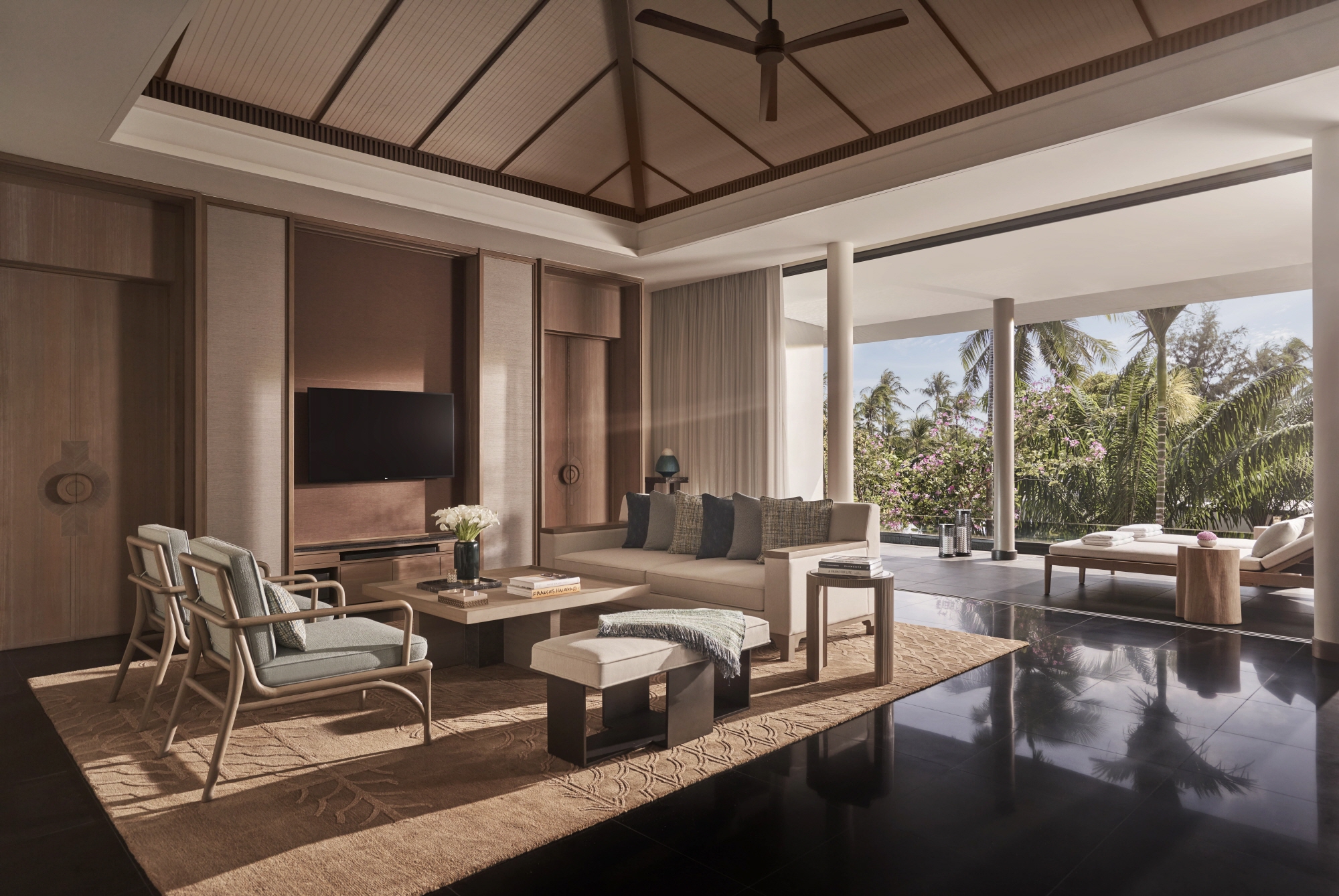 로비에 들어서면 차분하면서도 우아한 공간이 나타난다. 체크인 리셉션과 편안하고 실용적인 의자와 테이블이 있습니다. 푸꾸옥 패밀리 풀빌라를 위해 이곳에 왔는데, 온 가족이 아주 고풍스럽고 기억에 남는 공간이라고 합니다.